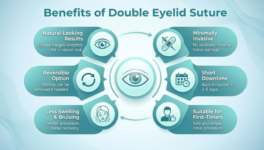 Double eyelid suture is a non-incisional technique that creates a natural eyelid crease using medical-grade sutures instead of cutting the skin. This technique works great for people with monolids or anyone looking for a low-key, natural double eyelid without the long recovery of regular surgery